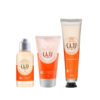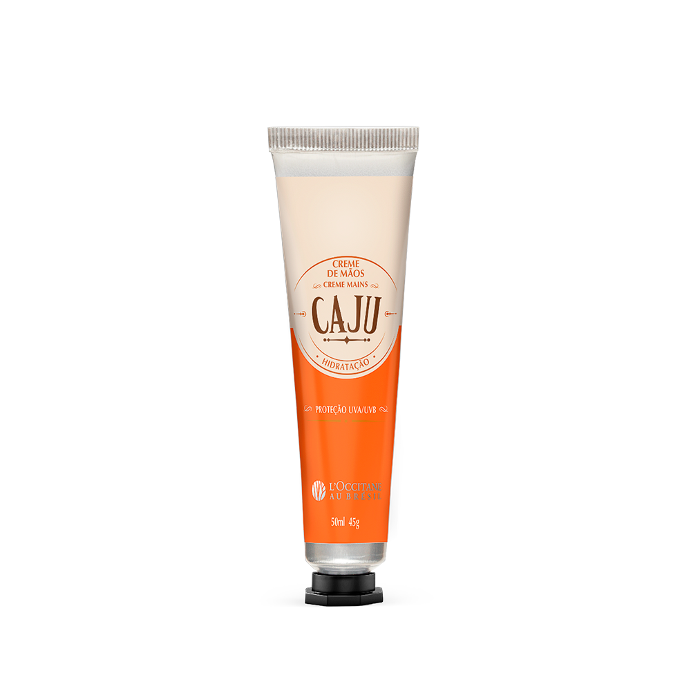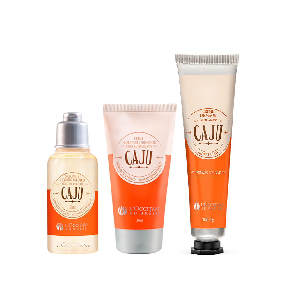 Essa composição contém Sabonete Líquido em Óleo Caju 50ml, Creme Hidratante Firmador Caju 50ml e Creme de Mãos Multibenefícios Caju. Uma linha de cuidados que proporciona uma ação firmadora na pele imediatamente após a aplicação.